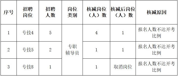 按照《beat365英国官方网站2019年公开招聘工作人员公告》要求 “岗位资格审查合格人数与拟招聘人数原则上应达3:1以上方可开考,报名人数不达该比例的招聘岗位,按规定的比例相应核减岗位,如减少到1名仍达不到3:1的岗位,原则上取消招聘岗位,并在发布公告的同一网站发布补充公告,同时负责告知被取消岗位的报名人员”,根据报名情况,经学院公开招聘领导组研究,决定核减部分岗位(人)数。现就相关事宜公告如下: