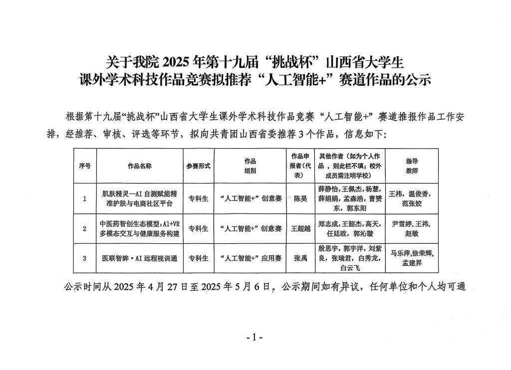 关于beat3652025年第十九届“挑战杯”山西省大学生课外学术科技作品竞赛拟推荐“人工智能+”赛道作品的公示