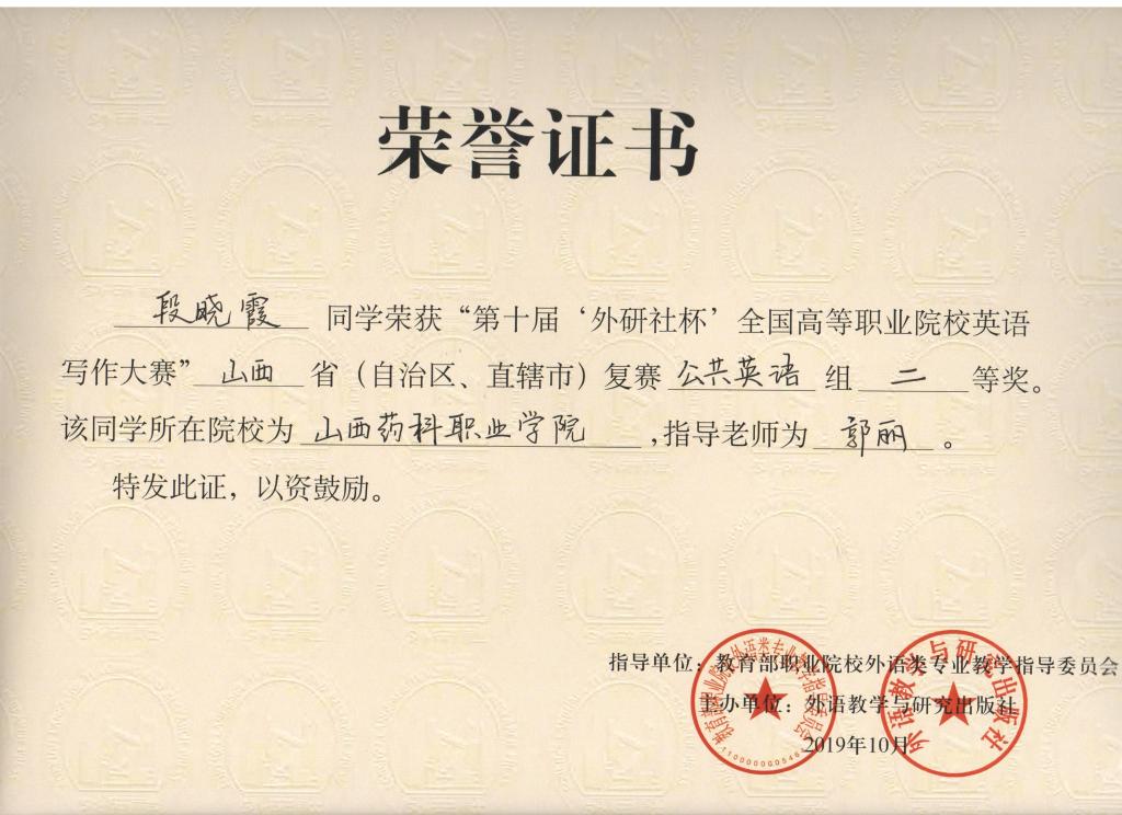 近日,“外研社杯”全国高等职业院校英语写作大赛官网公布了第十届“外研社杯”全国高等职业院校英语写作大赛复赛山西赛区获奖名单,由基础部温鹏程老师指导的刘惠玲同学荣获特等奖,郭丽老师指导的段晓霞同学荣获二等奖。