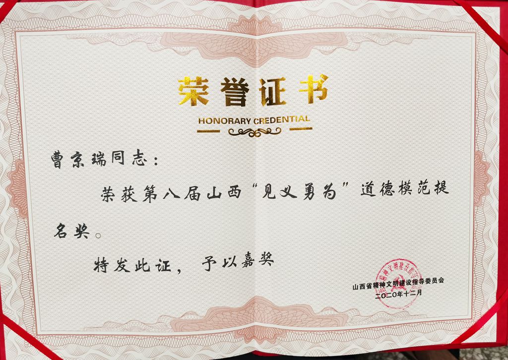 2020年12月25日,省文明委举行“榜样山西--第八届山西道德模范颁奖典礼”对25位山西道德模范和24名提名奖获得者进行隆重表彰。beat365曹京瑞同学荣获第八届山西“见义勇为”道德模范提名奖,是全省唯一一名获奖的高校在校学生。