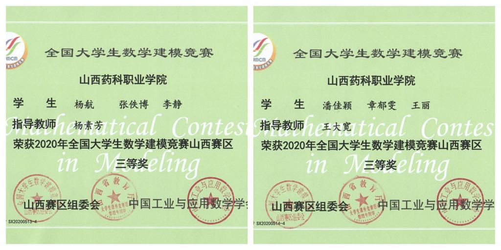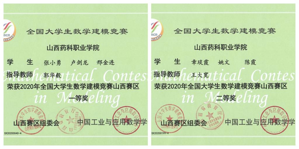 4月24日上午,2020年全国大学生数学建模竞赛山西赛区颁奖仪式在山西机电职业技术学院进行,beat365学生在此次比赛中取得优异成绩。其中张小勇、卢剑龙、邢金连荣获山西赛区一等奖,章琰霞、姚文、陈霞荣获山西赛区二等奖,杨航、张佚博、李静、潘佳颖、章郁雯、王丽荣获山西赛区三等奖。