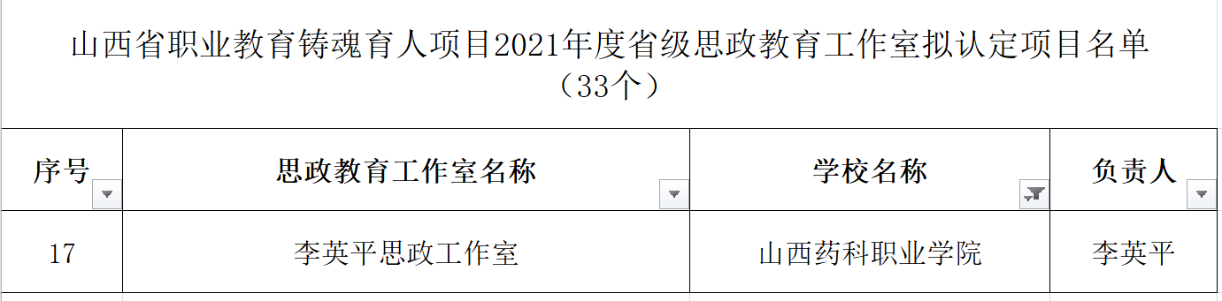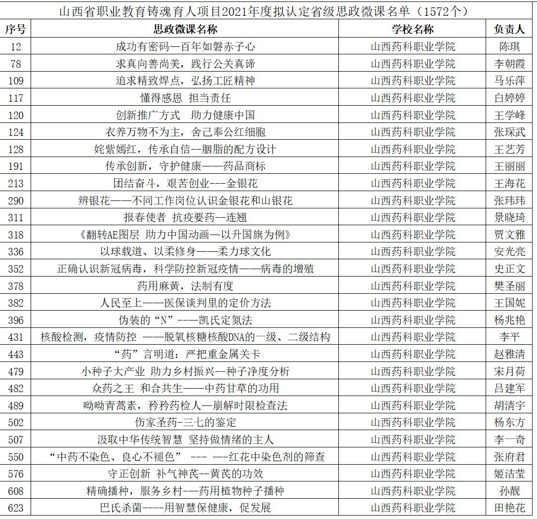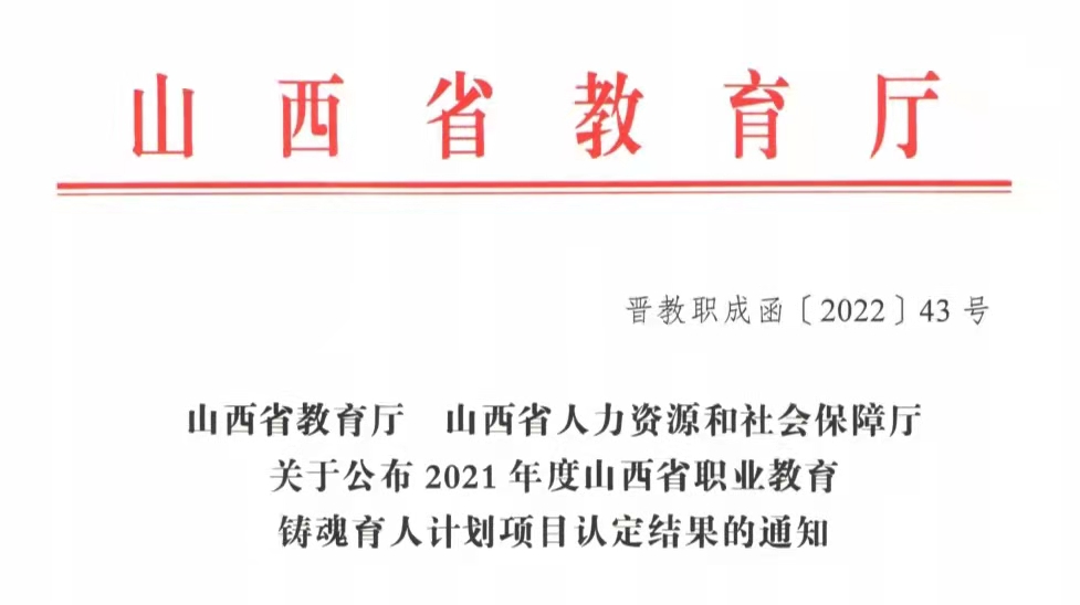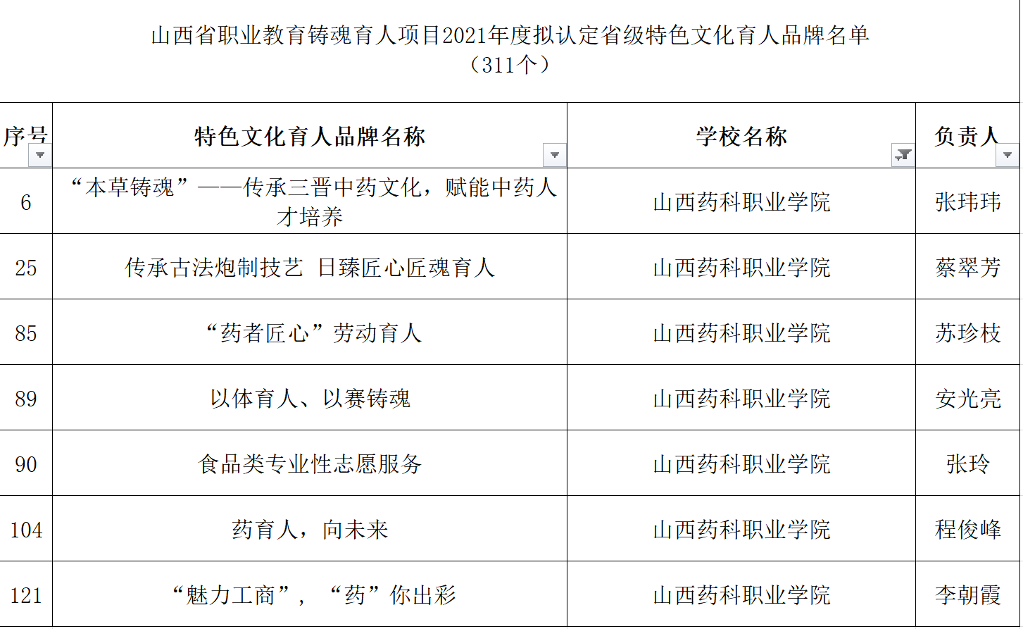 近日,山西省教育厅公布2021年度职业教育铸魂育人计划项目认定结果,beat365铸魂育人“三个一工程”建设喜获佳绩。“李英平思政工作室”被认定为省级职业教育思政教育工作室, “‘本草铸魂’——传承三晋中药文化,赋能中药人才培养”等7个项目被认定为省级职业教育特色文化育人品牌,《成功有密码—百年如磐赤子心》等28个微课被认定为省级职业教育思政微课,“‘扣好人生第一粒扣子’入学教育月活动”被认定为省级特色文化育人品牌培育建设项目。