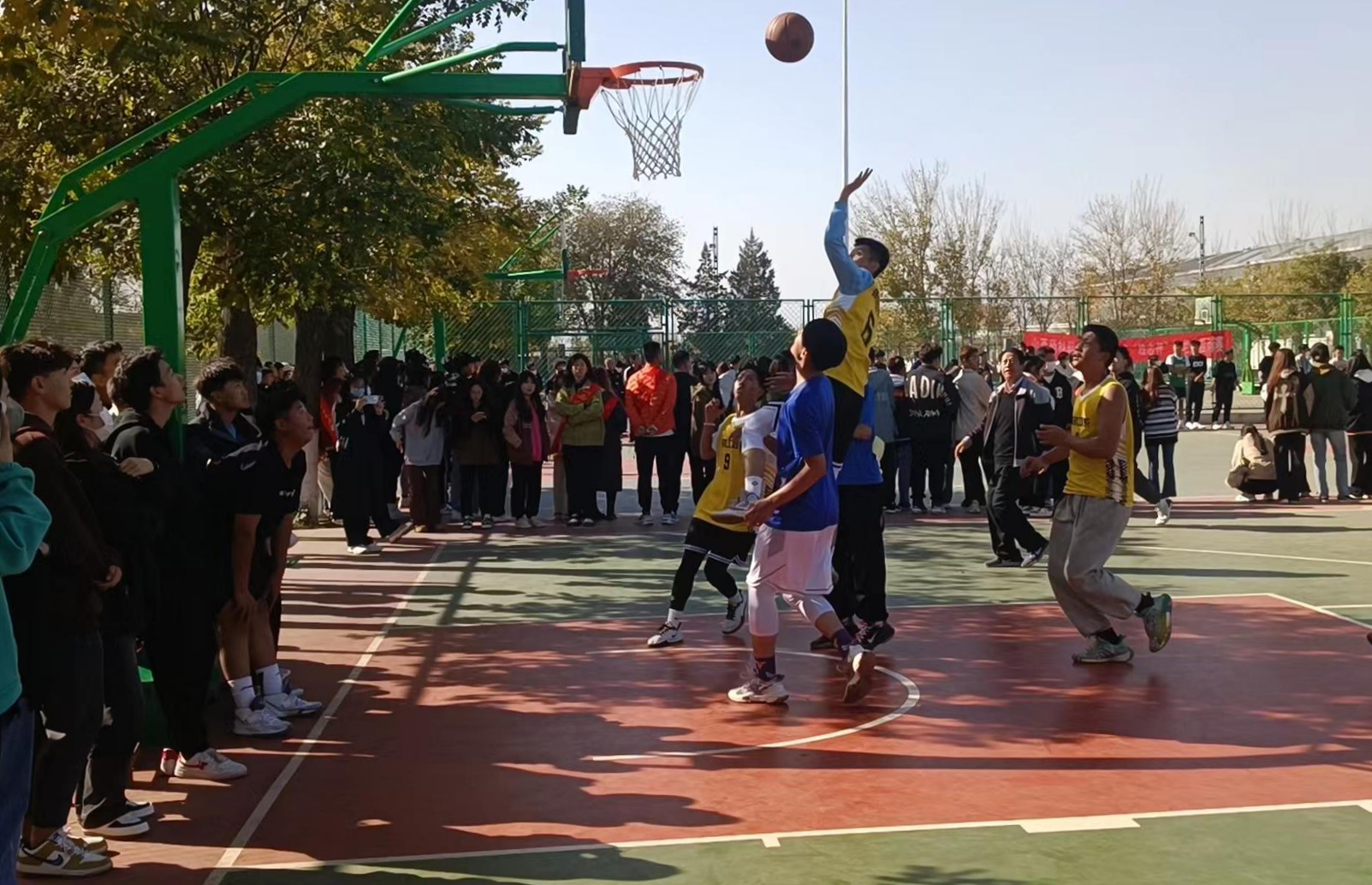 伴随着一声哨响,双方球队队员向高空奋力一跃,激动人心的篮球决赛终于拉开帷幕。赛场上,队员们神情专注、全力以赴,帅气地运球、传球,自信地上篮、投篮,熟练地运球、默契地配合让他们拿下一分又一分,尽显青春风采。汗水洒落球场、篮球落入篮筐、比赛进入僵持状态……球场上的状况也时刻牵动着围观同学们的心,他们将关心化作阵阵呐喊助威,响彻篮球场上空。