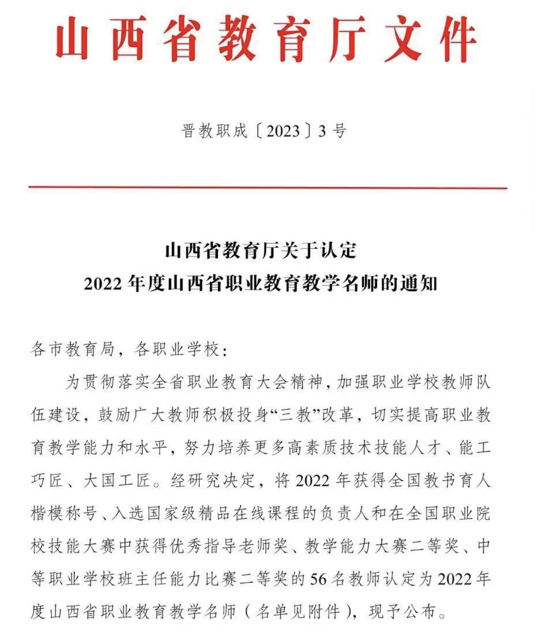 2月21日,山西省教育厅发布了2022年度山西省职业教育教学名师名单,beat365中药系教师张玮玮副教授位列其中。
