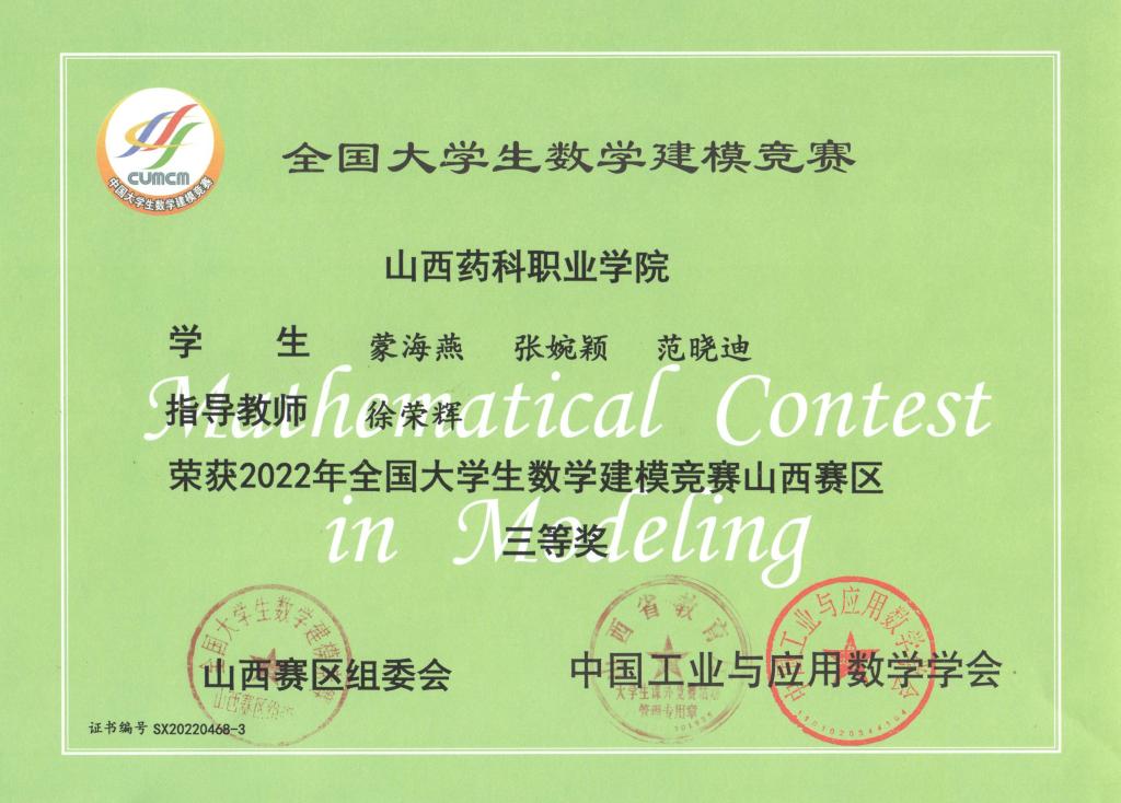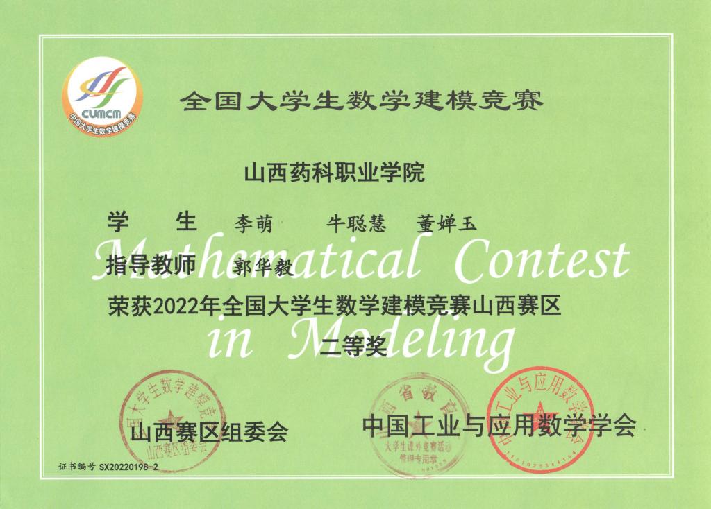 近日,2022年全国大学生数学建模竞赛山西赛区颁奖仪式在山西财政税务专科学校进行,beat365学生在此次比赛中取得优异成绩。其中李萌、牛聪慧、董婵玉荣获山西赛区二等奖,蒙海燕、张婉颖、范晓迪荣获山西赛区三等奖,陈卓蕾、焦家和、李庆荣获优秀奖。