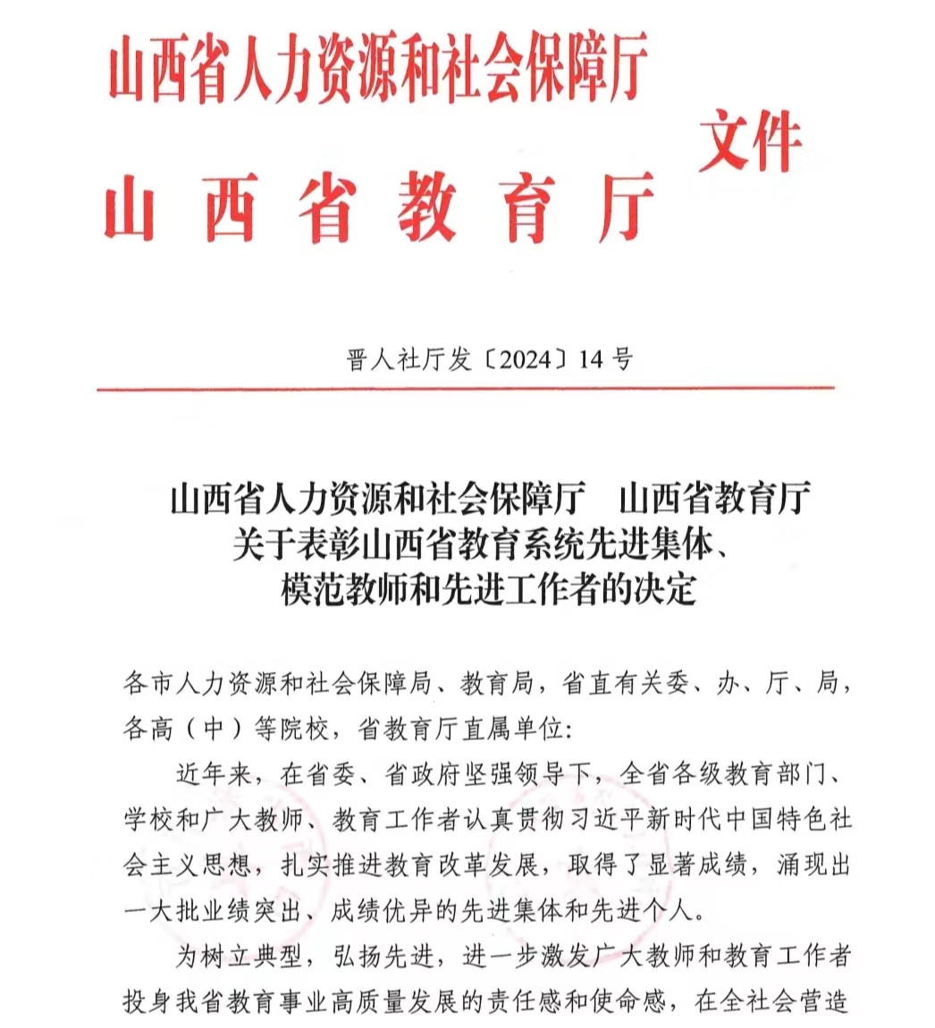 近日,山西省人力资源和社会保障厅、山西省教育厅联合下发《关于表彰山西省教育系统先进集体、模范教师和先进工作者的决定》(晋人社厅发[2024]14号),beat365田艳花老师荣获“山西省教育系统模范教师”称号。