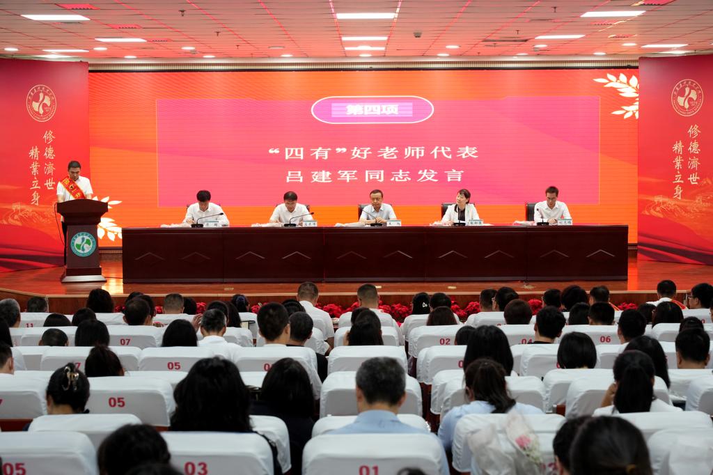 中药系主任吕建军作为“四有”好老师和“三全育人”先进教育工作者代表发言,表示将自觉弘扬践行教育家精神,牢记初心使命,以更加饱满的热情、更加昂扬的斗志参与到学院“双高”建设中来,为建成全国一流药科职业院校贡献智慧和力量。