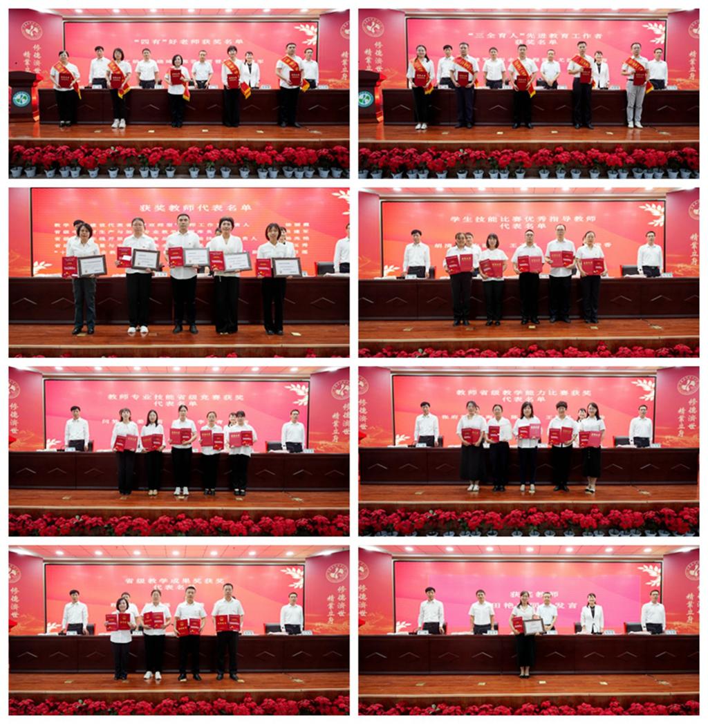 院纪委书记庄东军宣读《关于表彰第二届“四有”好老师和“三全育人”先进教育工作者的决定》,对刘文娟等5名“四有”好老师、高建军等5名“三全育人”先进教育工作者予以表彰。院党委委员、副院长刘志伟宣读《关于表彰2023-2024学年教职工教学专项建设成果和校外比赛获奖的决定》,对省级模范教师、教学成果获奖教师和指导学生技能比赛获奖教师、教学竞赛获奖教师以及省级教学团队予以表彰。与会院领导为受表彰的先进集体和个人颁奖。