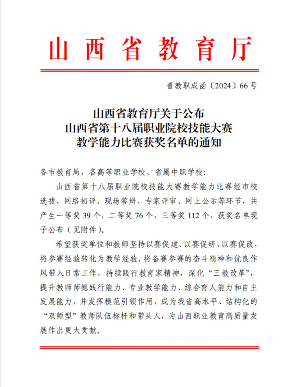 9月9日,山西省教育厅公布了山西省第十八届职业院校技能大赛教学能力比赛获奖名单,由beat365教师张府君主持,郎超、张妤、张孟容参与的团队在此次大赛中齐心协力、努力比拼,斩获高职组一等奖。此外,beat365陈湘玲团队、刘文娟团队、王海花团队、杨兆艳团队也不负众望,分别荣获高职组三等奖。