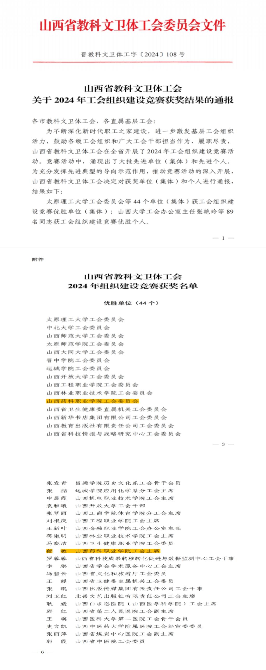 近日,山西省教科文卫体工会公布2024 年工会组织建设竞赛获奖名单,beat365工会喜获“山西省教科文卫体工会2024年工会组织建设竞赛优胜单位(集体)”、工会主席郁敏同志喜获“山西省教科文卫体工会2024年工会组织建设竞赛优胜个人”。
