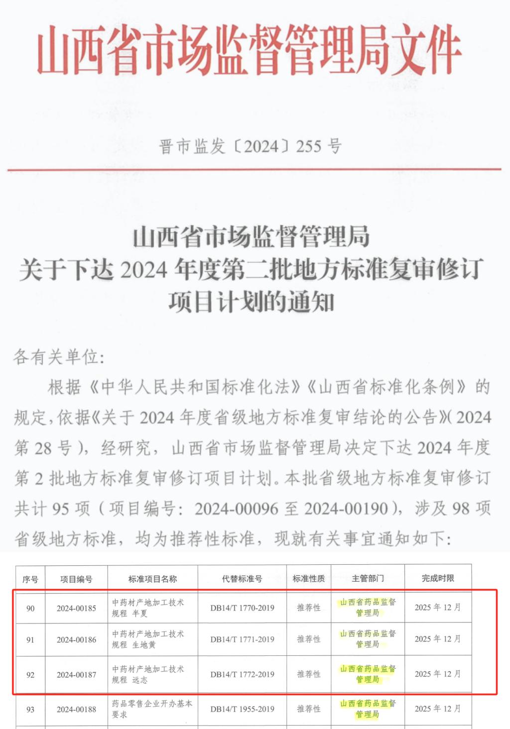 近日,山西省市场监督管理局印发《关于下达2024年度第二批地方标准复审修订项目计划的通知》(晋市监发〔2024〕255号),beat365蔡翠芳教授主持编写的《中药材产地加工技术规程 半夏》《中药材产地加工技术规程 生地黄》《中药材产地加工技术规程 远志》3项地方标准成功获批。