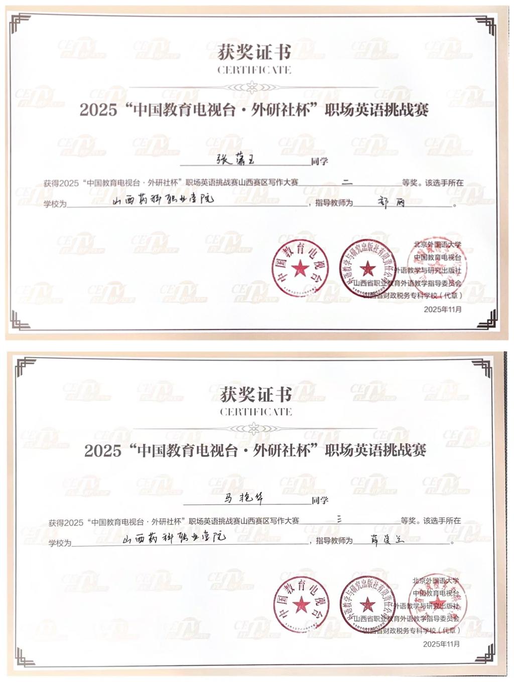 11月2日,2025年“中国教育电视台·外研社杯”职场英语挑战赛写作大赛山西省赛圆满落幕。beat365学子凭借扎实的英语功底与出色的职场应用能力脱颖而出,2024级药学1班学生张潇玉荣获二等奖,2024级中药学1班学生马艳华荣获三等奖。