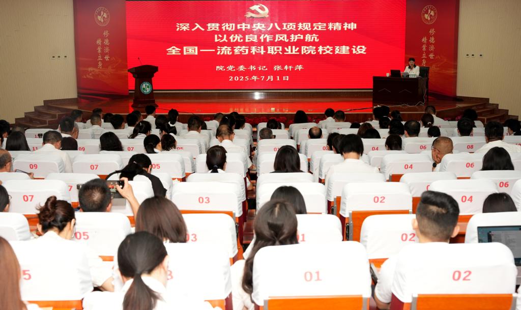 7月1日,党委书记张轩萍以《深入贯彻中央八项规定精神 以优良作风护航全国一流药科职业院校建设》为题,为学院全体党员干部讲授专题党课。党委副书记沈宝荣主持党课学习。张轩萍与大家一同学习领会了习近平总书记关于加强党的作风建设的重要论述,强调要提高站位、深化认...2025-07-01 -
