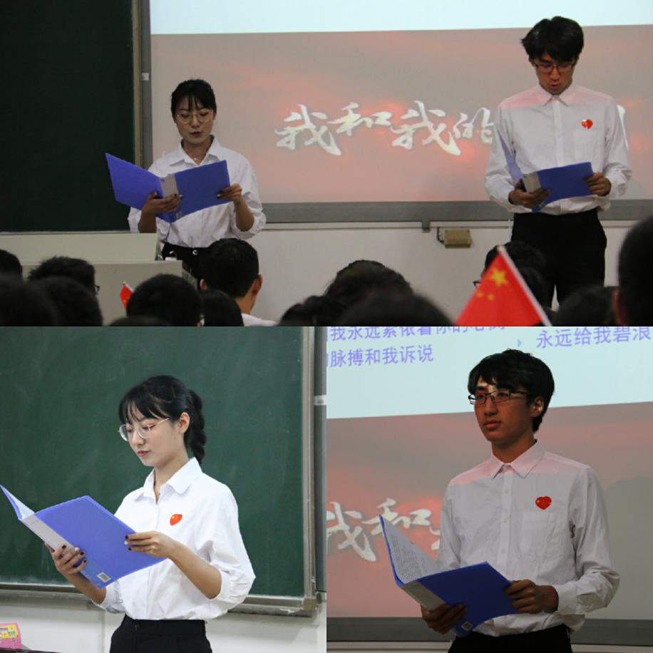 课程过半之时,陈嘉老师走下讲台,与助教一起给同学们发放了小红旗及国旗面贴,在其他同学的惊喜和期待中,同选本门课程的卫宇轩同学和柯雅静同学走上讲台,随着钢琴的伴奏,他们深情朗诵了诗歌《我的祖国》。字句铿锵,意气昂扬,他们用青春朝气,道出了青年一代对祖国炽热的情感,引发了台下同学的强烈共鸣。