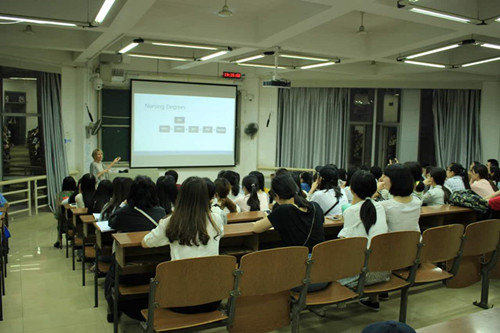 次日,Robin Whittemore教授在福庆楼T208为我院师生主讲了“走进耶鲁大学”讲座,讲座由郭佳副教授主持。Whittemore教授就耶鲁大学护理专业的各个项目做了一一介绍,并且详细说明了每个项目的培养目的与培养方案,其中包括护理专业学位博士项目(DNP),是这几年兴起的项目,致力于培养学生的临床实践能力以及领导能力。她提到,在美国,护士是最被认可和最值得信赖的社会角色。之后,Whittemore教授还分享了她所完成的基于移动技术的糖尿病教育研究项目的进展,讲座现场气氛活跃,与会者细心聆听,互动频繁,气氛活跃,会后争相提问,纷纷表示Whittemore教授的讲座给了大家很多对于护理学专业发展的思考和认同。