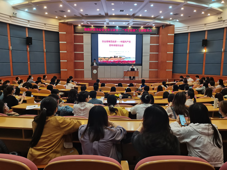 2021年5月26日下午,在湘雅医学院福庆楼四楼学术报告厅,bat365在线平台网站登录党委书记李涛同志为全体党员、教职员工、学生骨干讲授党史学习教育第三专题“学史崇德”专题党课。党课由袁世平副书记主持,全体党员参加。
