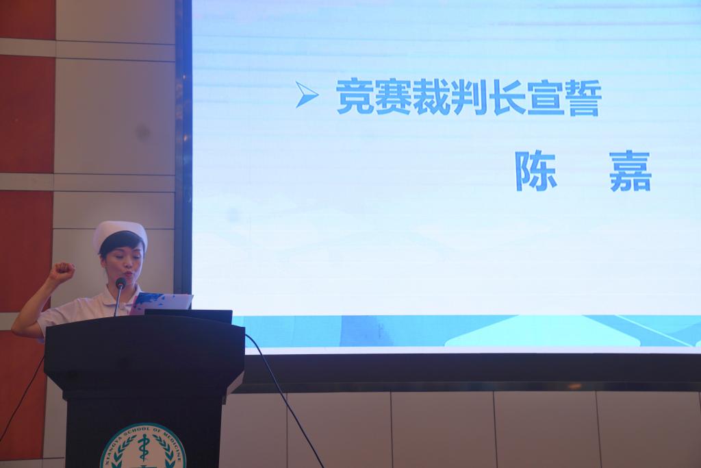 王红红详细解读了赛事总体要求、情景模拟护理操作各环节规则。裁判长陈嘉代表全体评委郑重承诺在比赛期间将严守公开、公平、公正原则,全心全意做好竞赛评判工作。