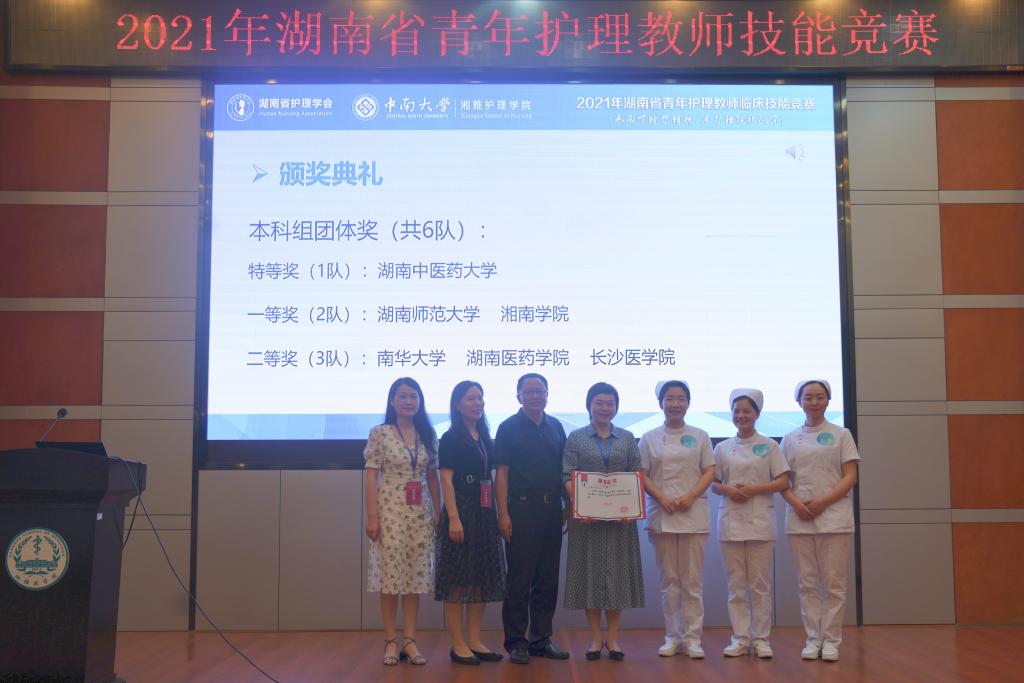 本次竞赛内容包括有心电监护,肌内注射,静脉输液三个项目。来自湖南省内6个本科院校,4个高职院校的30位护理专业老师参赛。他们凭借着规范熟练的操作,贴心的人文关怀与良好的综合素质向大家展示了扎实的理论基础和娴熟的临床护理实践技能。最后,本科组团体奖中湖南中医药大学获得特等奖,湖南师范大学、湘南学院获得一等奖,南华大学、湖南医药学院、长沙医学院获得二等奖。高职高专组团体奖中湖南环境生物职业技术学院获得特等奖,湘潭医卫职业技术学院、长沙卫生职业学院获得一等奖,益阳医学高等专科学校获得二等奖。本科组单项奖中,湖南中医药大学袁群获心电监护单项奖,湖南中医药大学伍永慧获肌内注射单项奖,湖南师范大学吴彦获静脉输液单项奖;高职高专组单项奖中,湖南环境生物职业技术学院李琅获心电监护单项奖,长沙卫生职业学院石秀兰获肌内注射单项奖,湖南环境生物职业技术学院肖东玲获静脉输液单项奖。湖南中医药大学的彭丽丽、霍依和湖南环境生物职业技术学院的雷巍娥、罗明慧荣获优秀指导教师奖。