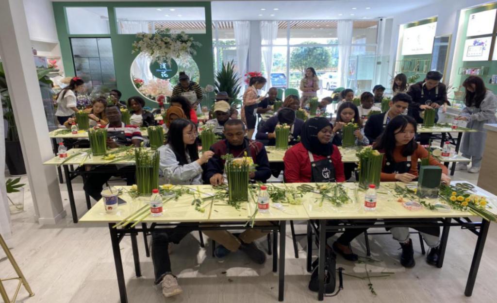 After the meeting, everyone drove to the flower arrangement location together. After arriving at the designated place, the international students were attracted by the warmly decorated flower shop with an elegant environment and took photos.