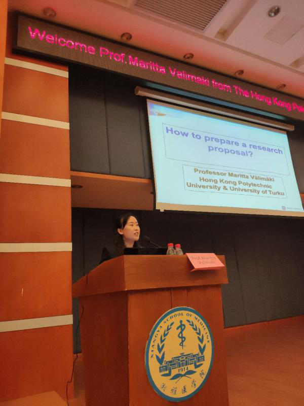 At 10:30 am, Professor Maritta Valimaki brought a lecture entitled "How to Write a Research Proposal" to doctoral and master students of Xiangya Medical School in the International Lecture Hall on the fourth floor of Fuqing Building. First of all, Professor Maritta Valimaki expressed her great honor to have the opportunity to exchange and give lectures in Xiangya Nursing School and gave full affirmation and encouragement to students to choose nursing major. Professor Maritta Valimaki then gave a thorough and detailed lecture on how to do high-quality nursing research. She said that good nursing research should be innovative, high quality and influential, and should be as narrow as possible to one center. Professor Maritta Valimaki's professional, detailed and flexible presentation gave students a deeper understanding of how to do quality nursing research. There was a strong academic atmosphere on the scene. Students eagerly asked questions, and Professor Maritta Valimaki answered them carefully. At the end of the lecture, Vice President Li Xianhong thanked Professor Maritta Valimaki, and hoped that the students could learn and comprehend the teaching content, gain something, and actively apply it to nursing research practice.