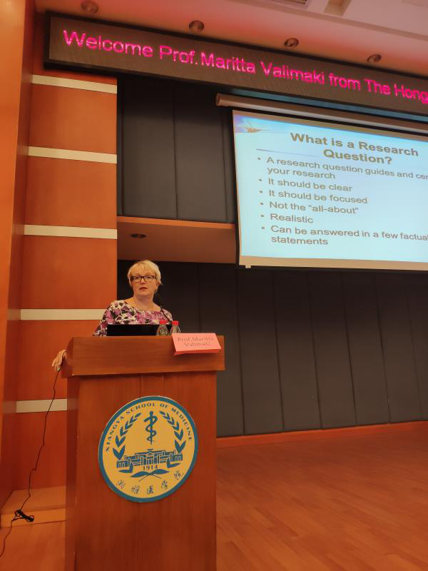 On the morning of 29 September 2018, Professor Maritta Valimaki, Deputy Director of the School of Nursing at The Hong Kong Polytechnic University, Chair of the Research Committee, Visiting Professor of the George School of Health and Social Care, University of London, UK, and honorary Lecturer of the University of Tampere, Finland, paid a visit to Xiangya Nursing School of Central South University.
