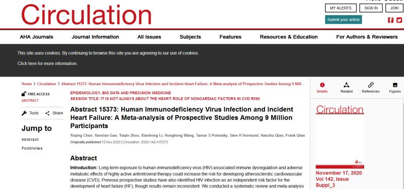 Recently, the AIDS prevention and control research team of our hospital published a research Abstract entitled “ Human Immunodeficiency Virus Infection and Incident Heart Failure: A Meta-analysis of Prospective Studies Among 9 Million Participants” in CIRCULATION (Journal of CIRCULATION, IF=23.603). The 2019 postgraduate student Chen Yuqing was the first author. Professor Qian Hanzhu, Frank...