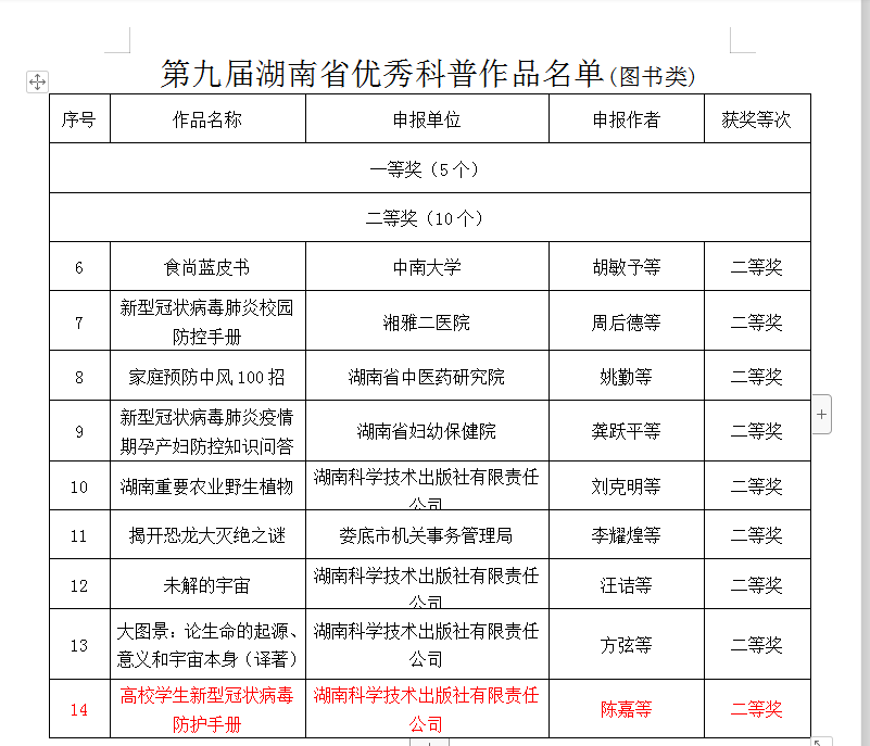 Covid-19 Protection Manual for College Students, Edited by Hunan Key Laboratory of Xiangya School of Nursing, Won the Second Prize of the 9th “Hunan Provincial Outstanding Science Popularization Award”