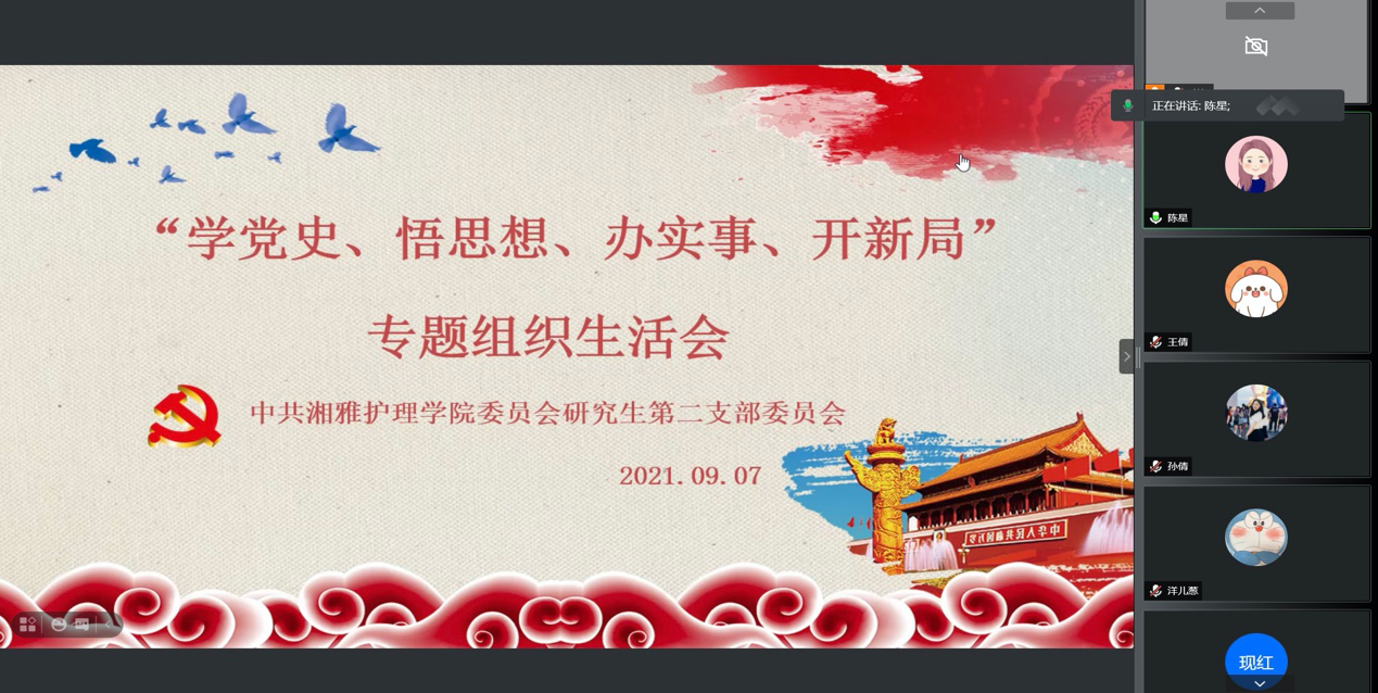 2021年9月7日晚上7:00,研究生第四党支部召开bat365在线平台网站登录研究生第四党支部“学党史、悟思想、办实事、开新局”专题组织生活会。学院党委书记李涛、学院党委委员、副院长李映兰到会指导。民主生活会由支部书记丁金锋主持。本次专题组织生活会是护理学院研究生第四(博士)党支部的第一次民主生活会,支部联系人李映兰和支委班子高度重视此次民主生活会,坚决贯彻落实学校党委和学院党委部署,在会议召开前做了大量严肃认真的准...