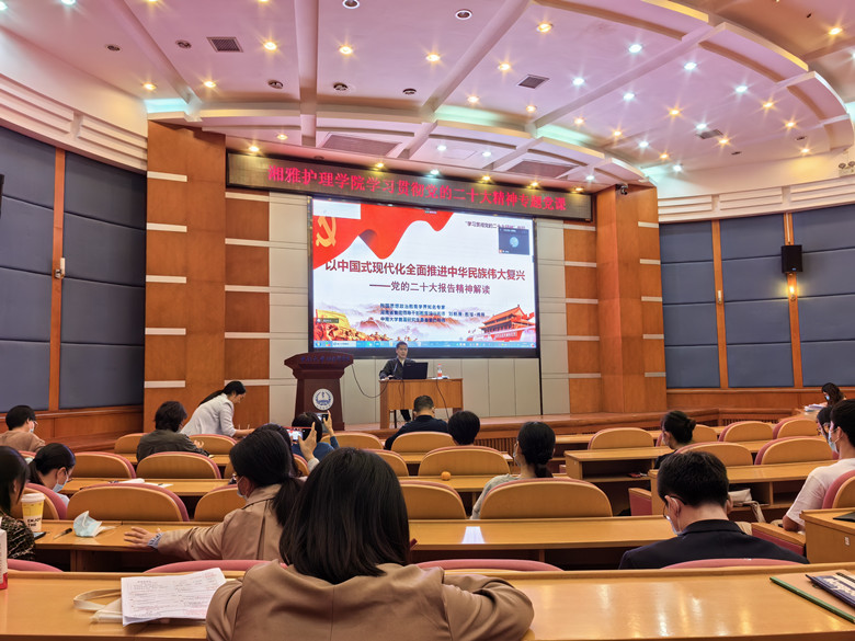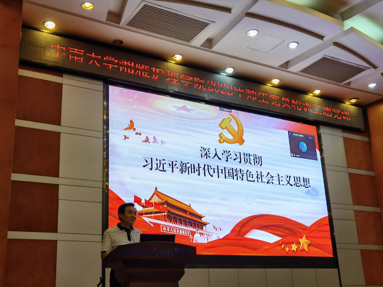 2022年11月9日下午,bat365在线平台网站登录在福庆楼学术报告厅组织开展“学习贯彻党的二十大精神”专题党课学习活动。我校思想政治教育知名教授、湖南省首批领导干部教育培训名师刘新庚为全体党员讲了一堂题为《以中国式现代化全面推进中华民族伟大复兴——党的二十大报告精神解读》的专题党课。党课由专职组织员刘新娥主持,学院全体党员采取线上线下相结合的形式参加会议。 刘新庚采用图文讲解与视频播放相结合的方式,联系实际,深...