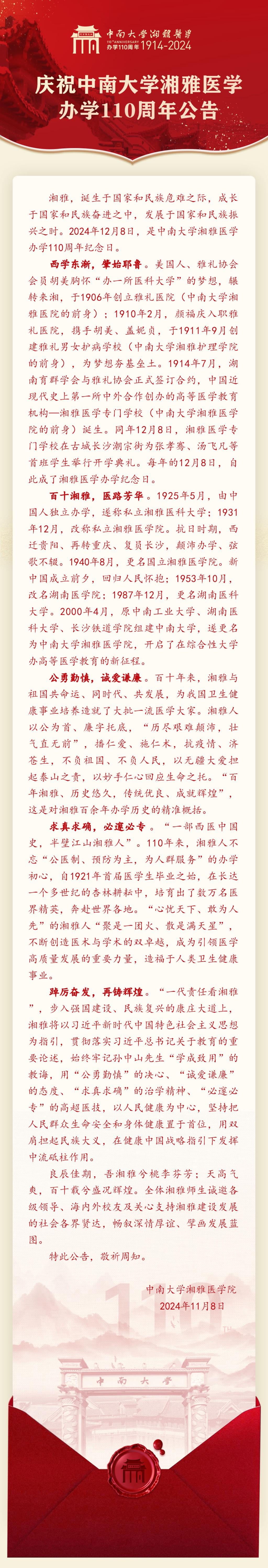 庆祝bat365在线平台网站登录湘雅医学办学110周年公告
