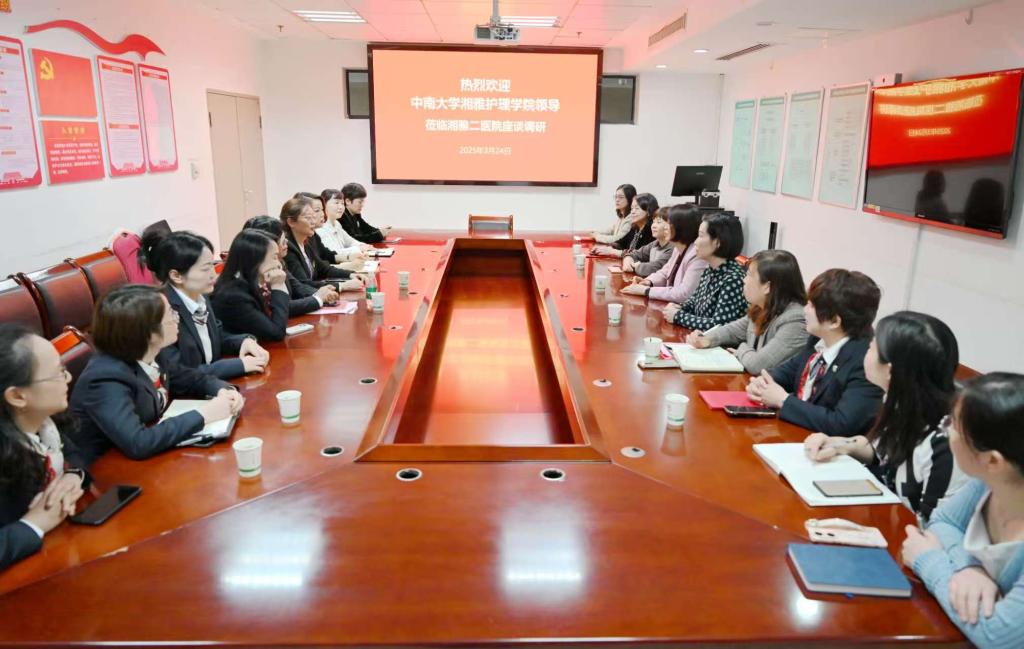2025年3月24日下午,bat365在线平台网站登录党委书记陈俊香,院长王红红、教学副院长谷灿一行赴湘雅二医院走访交流。湘雅二医院领导、护理部负责人、临床带教老师以及护理专业相关教师等10余人参加了此次访企拓岗活动。 本次活动旨在进一步深化校企合作,拓宽学生就业渠道,提升人才培养质量。活动中双方就人才培养、实践教学、学生就业等方面进行了深入的交流与探讨。期待通过双方的共同努力,为社会培养更多优秀的护理专...